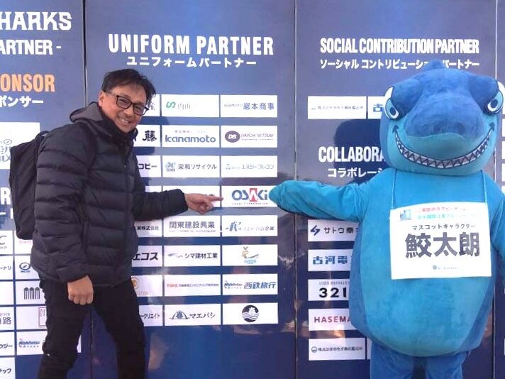 (写真左:マスコットキャラクター鮫太郎を囲んで集合写真📸)